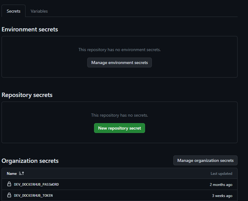 이건 Organization에 소속된 레포에만 해당되는데, 필자는 회사 Organization에서 작업하기 때문에 잘 쓰고 있다. 이곳에서 회사의 도커 레지스트리 정보와 같은, Organization에서 재사용될만한 변수들을 작성해주면 되겠다.