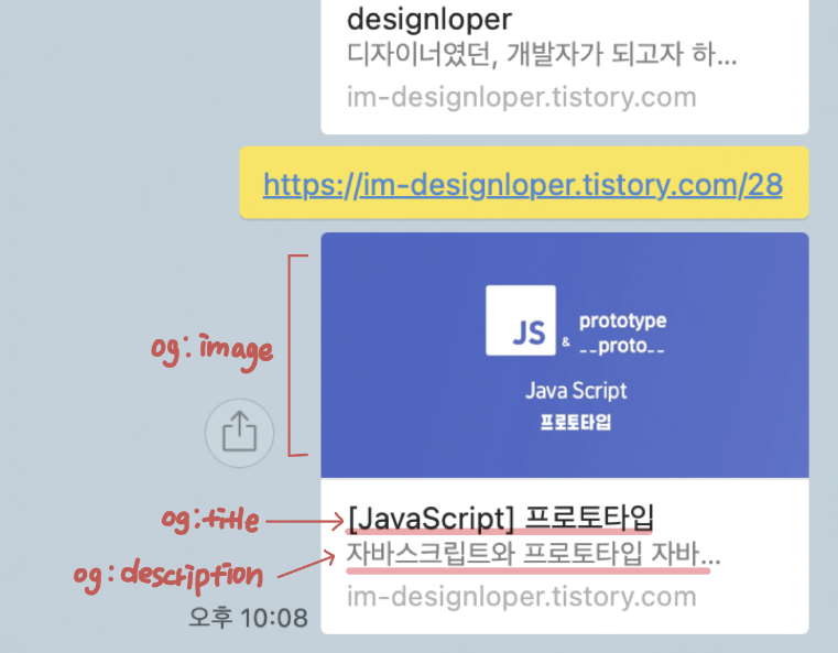 카톡서버에 공유한 URL의 정보가 캐시로 저장되어 있어서 바로 보이지 않는다.