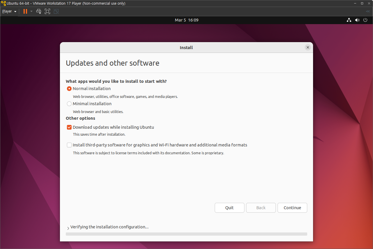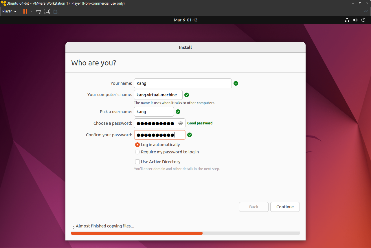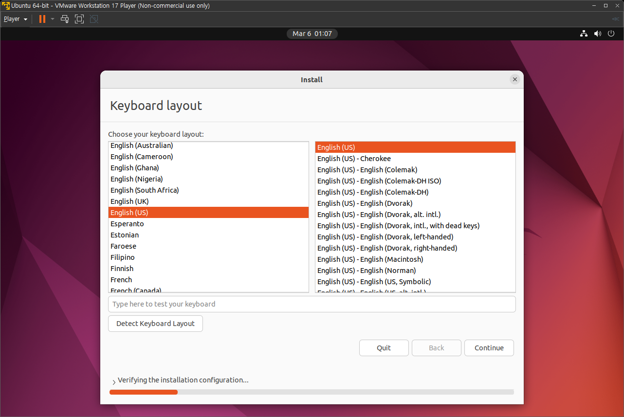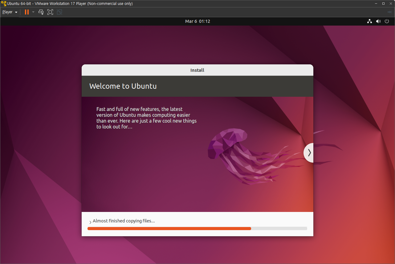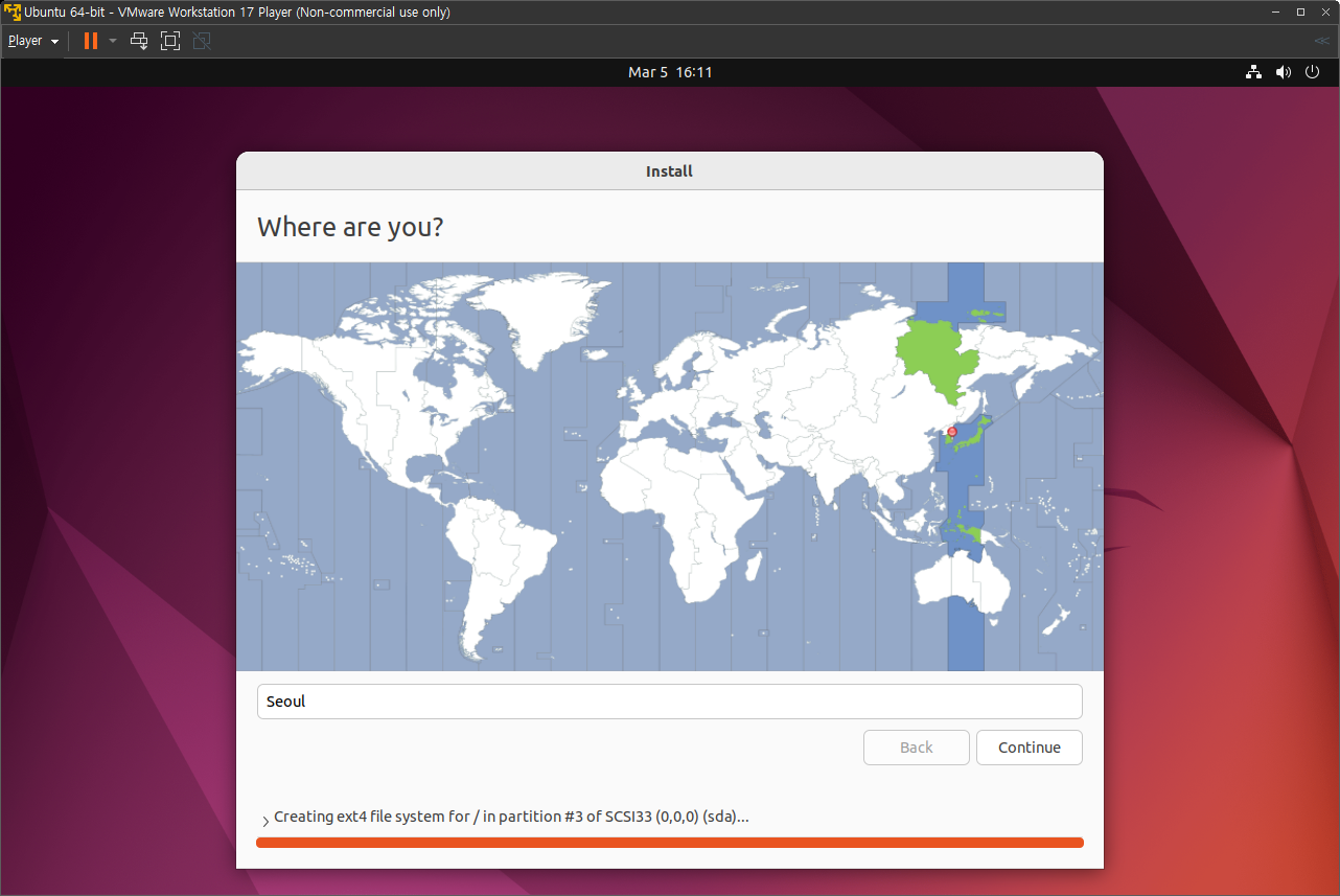 하드웨어 설정이 끝나면 우분투가 설치되기 시작하며, 아래와 같은 초기 설정을 하며,