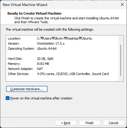 이제부턴 우분투를 설치할 VM의 하드웨어를 설정할 차례이다.