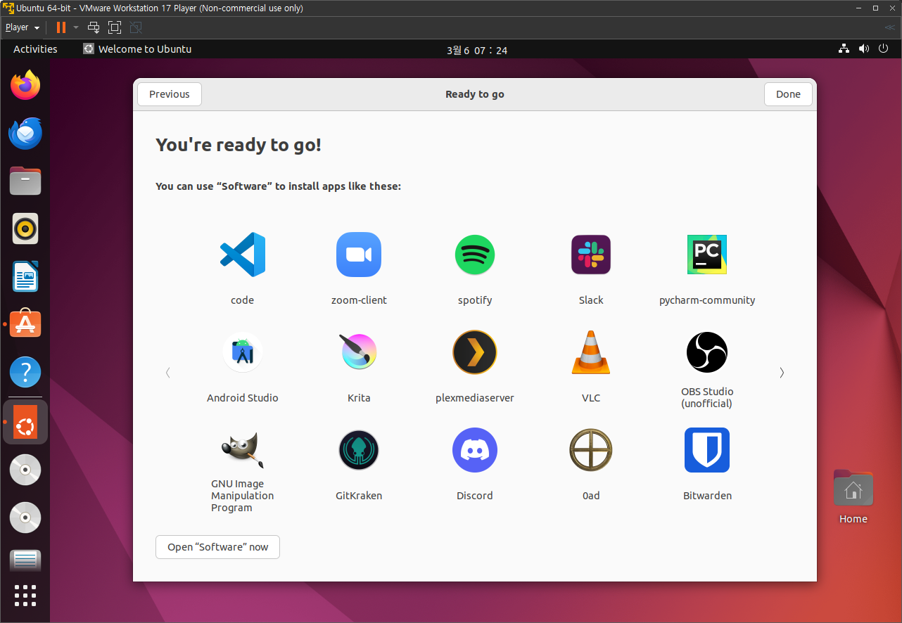 설치가 끝났다. 우측 상단의 Done을 눌러주고 Ctrl + Alt + T를 눌러 Terminal을 열어보자