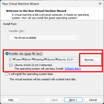 아래의 이미지에서 빨간 박스에서 .iso파일을 찾아 넣어준다.