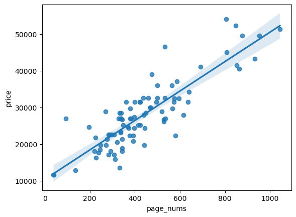 sns.regplot(data=df_n,x='page_nums',y='price')