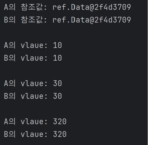 또한 dataA와 dataB는 같은 참조값인 ref.Data@2f4d3709를 가르키기 때문에 dataA와 dataB의 value는 같은 값인 20을 출력한다.*/