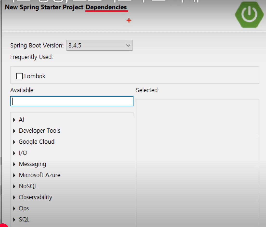 -- project 생성시에 Dependencies를 추가할 때 넣는 요소들