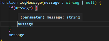 조건문의 분기에서 값의 타입이 어떻게 변하는지 살펴보는 것은 타입 시스템을 연마하는 매우 좋은 방법이다. 위 코드에서 조건문 외부에서의 타입은 string | null 이지만 내부는 string이다.