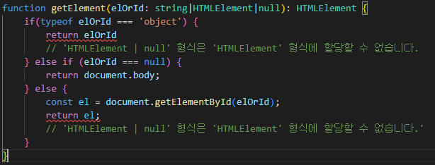 첫 번째 오류는 JS에서 typeof null 은 'object' 이므로 elOrId가 여전히 분기문 내에서 null일 가능성이 있어 발생했고, 두 번째 오류 또한 document.getElementById(elOrId) 가 null을 반환할 가능성이 있어 발생했다.