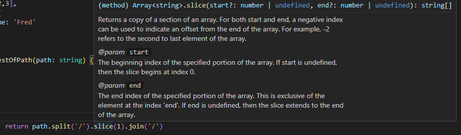 보통 심벌 위에 마우스 커서를 대면 TS가 그 타입을 어떻게 판단하고 있는지 확인할 수 있으며, 함수의 경우 반환타입을 지정해주지 않았어도 매개변수의 타입을 통해 반환값의 타입을 추론할 수 있다.