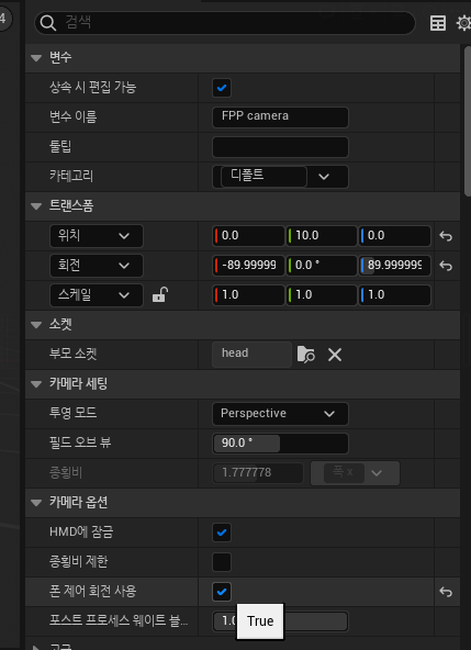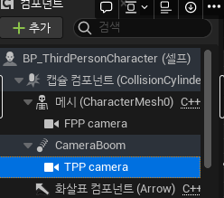 자동 활성화 체크해제 (1인칭을 기본으로 하고싶다면 FPP camera를 체크하고 TPP camera를 체크해제)