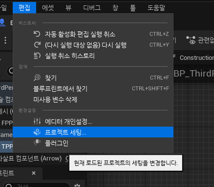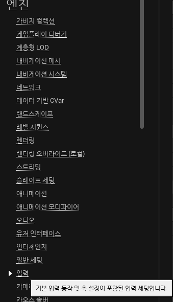 편집 > 프로젝트 세팅 > 엔진(입력)