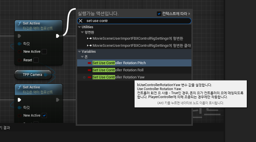 set use controller rotation yaw 노드 생성 (위 아래 둘다)