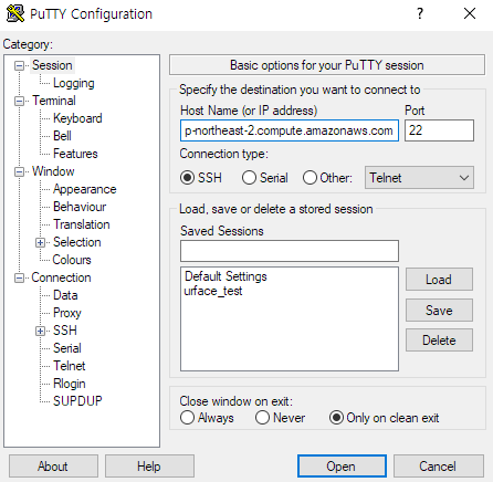 ์ด์ Putty๋ฅผ ์คํํด์ BastonHost์ ์ ์ํด๋ณด์. ์๋ ํผ๋ธ๋ฆญ IPv4 DNS์ ์ฃผ์๋ฅผ ๋ฃ์ด์ฃผ๋ฉด ๋์ด๋ค! (Login as ๋ผ๊ณ ๋จ๋ฉด ๊ทธ๋ฅ ec2-user๋ฅผ ์์ฑํด๋ผ ๊ทธ๋ผ ์ ์๋จ ใ