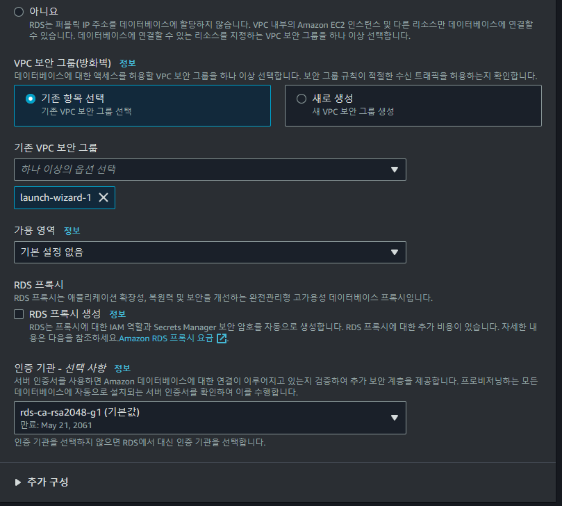 launch-wizard-1์ ์ธ๋ฐ์ด๋ ๊ท์น์์ MySQL/Aurora, TCP, 3306, ๋ชจ๋ ๋ก ์ค์ ํด์ฃผ์ด์ผํ๋ค.