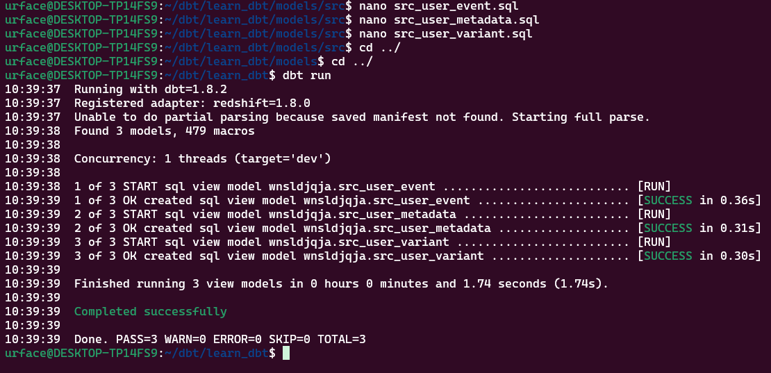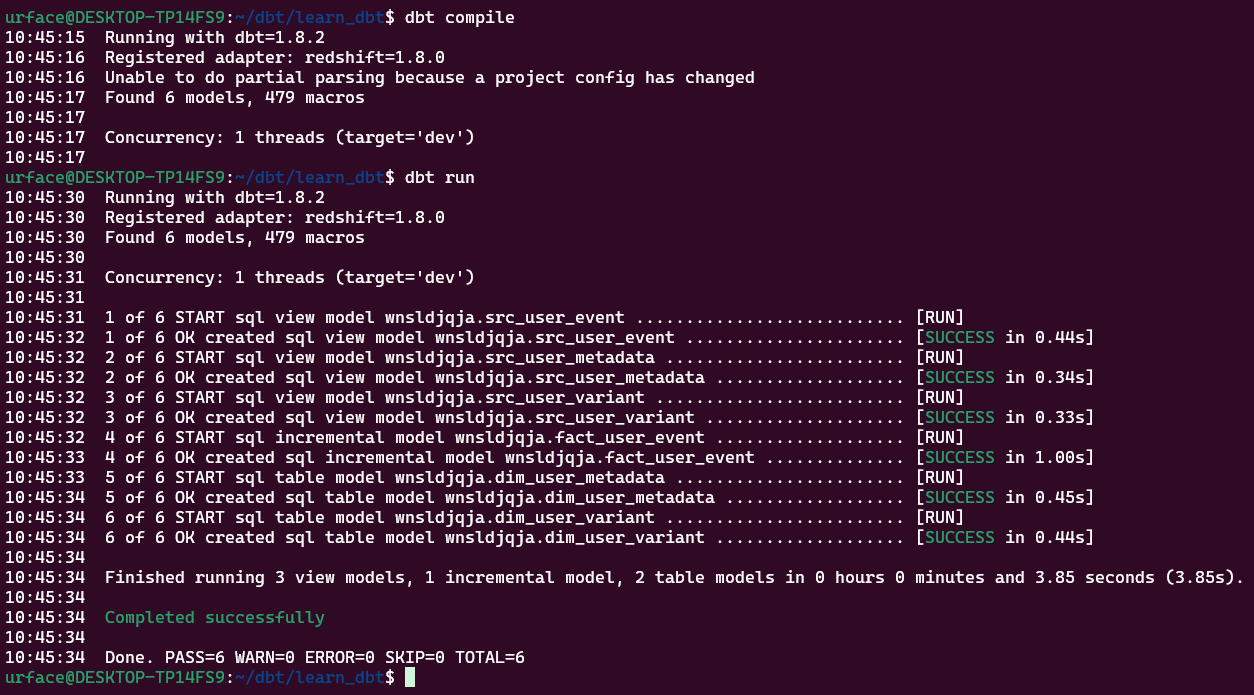 - dbt run์ ํ๋ก์ ํธ์ ๋ค์ํ SQL์ ์คํํ๋ค.