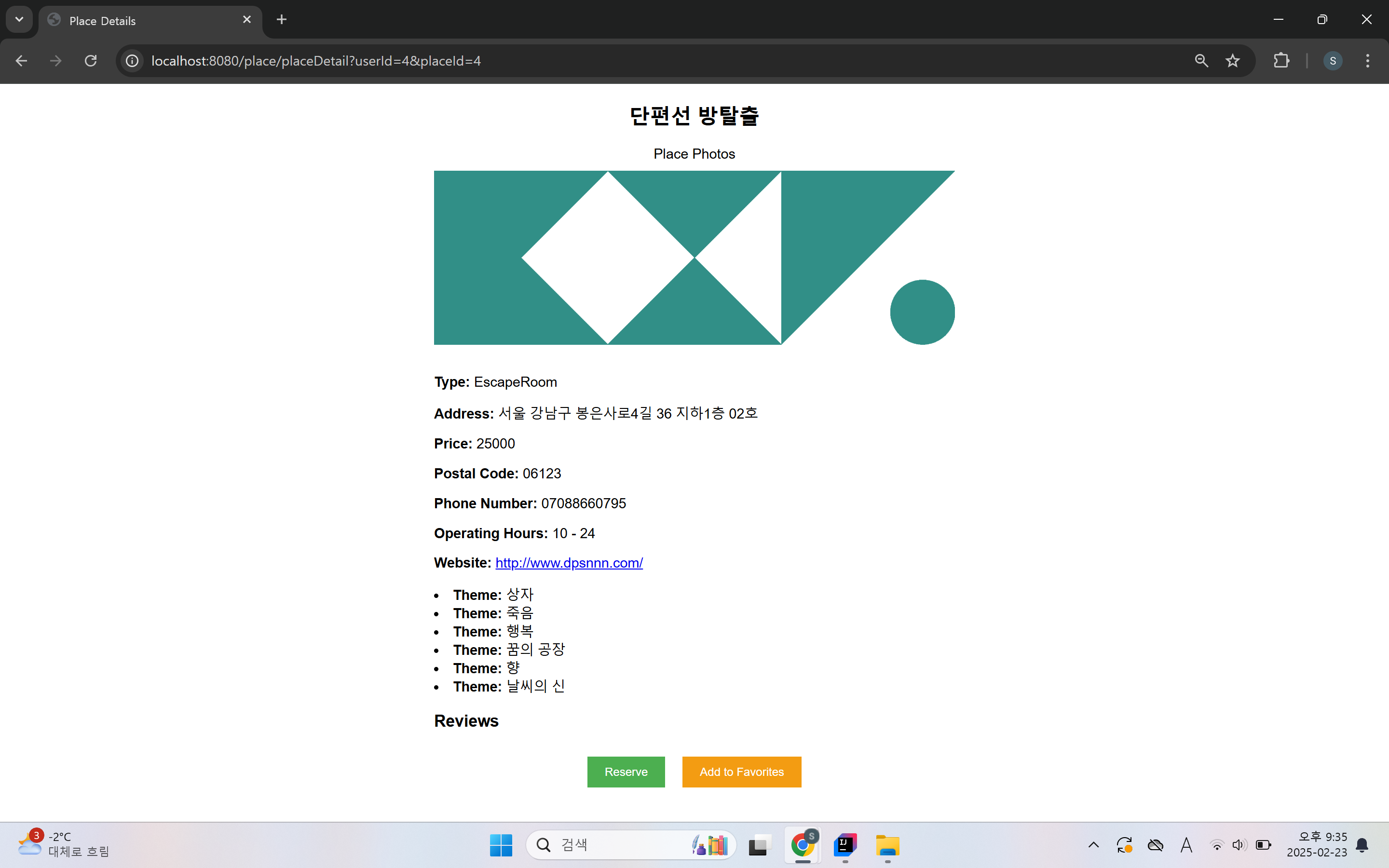 - 사진, 주소, 예약 가격, 우편번호, 매장전화번호, 운영시간, 웹사이트, 테마, 리뷰를 보여줍니다.