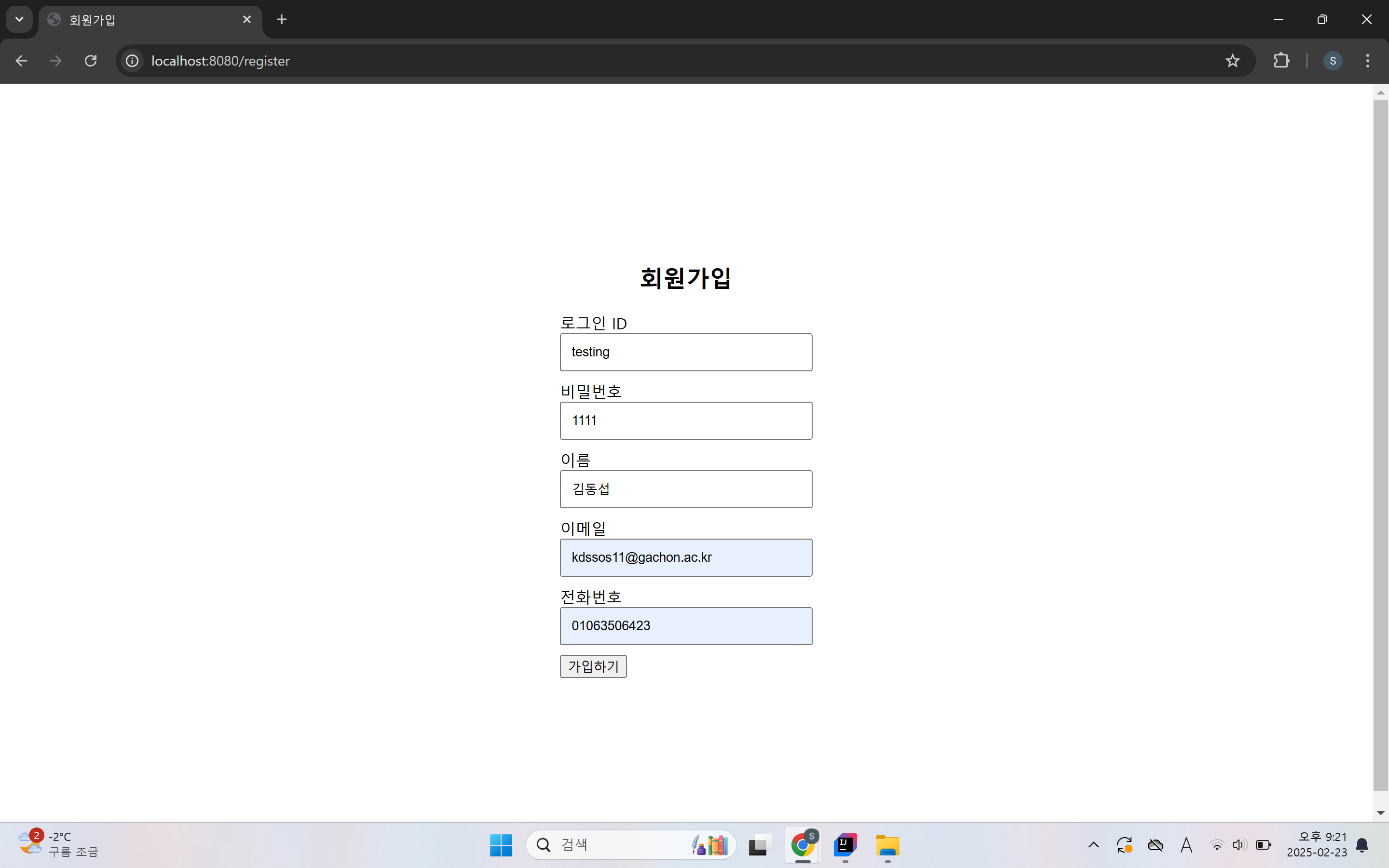 로그인ID, 비밀번호, 이름, 이메일, 전화번호 입력 후 회원가입을 진행합니다.