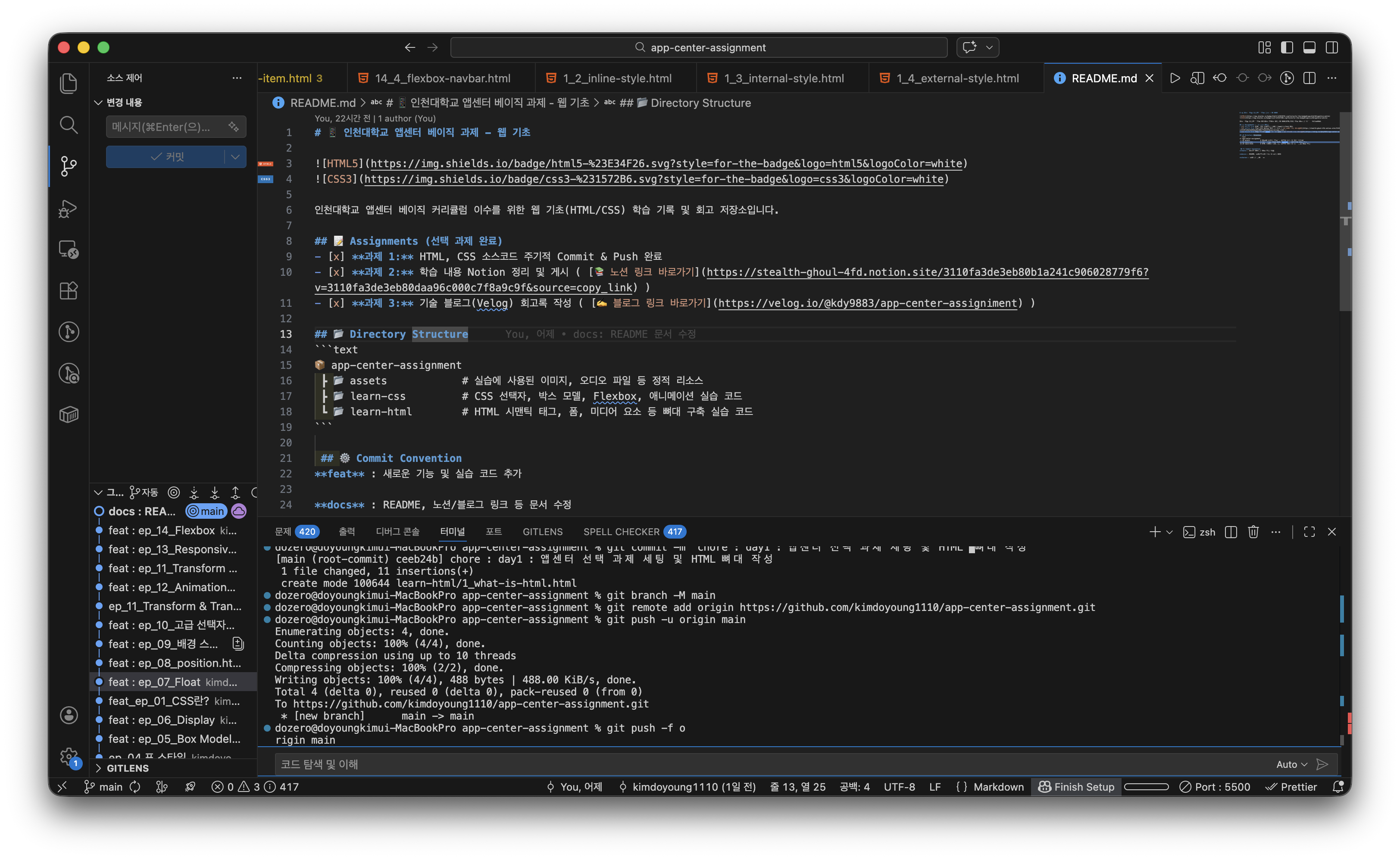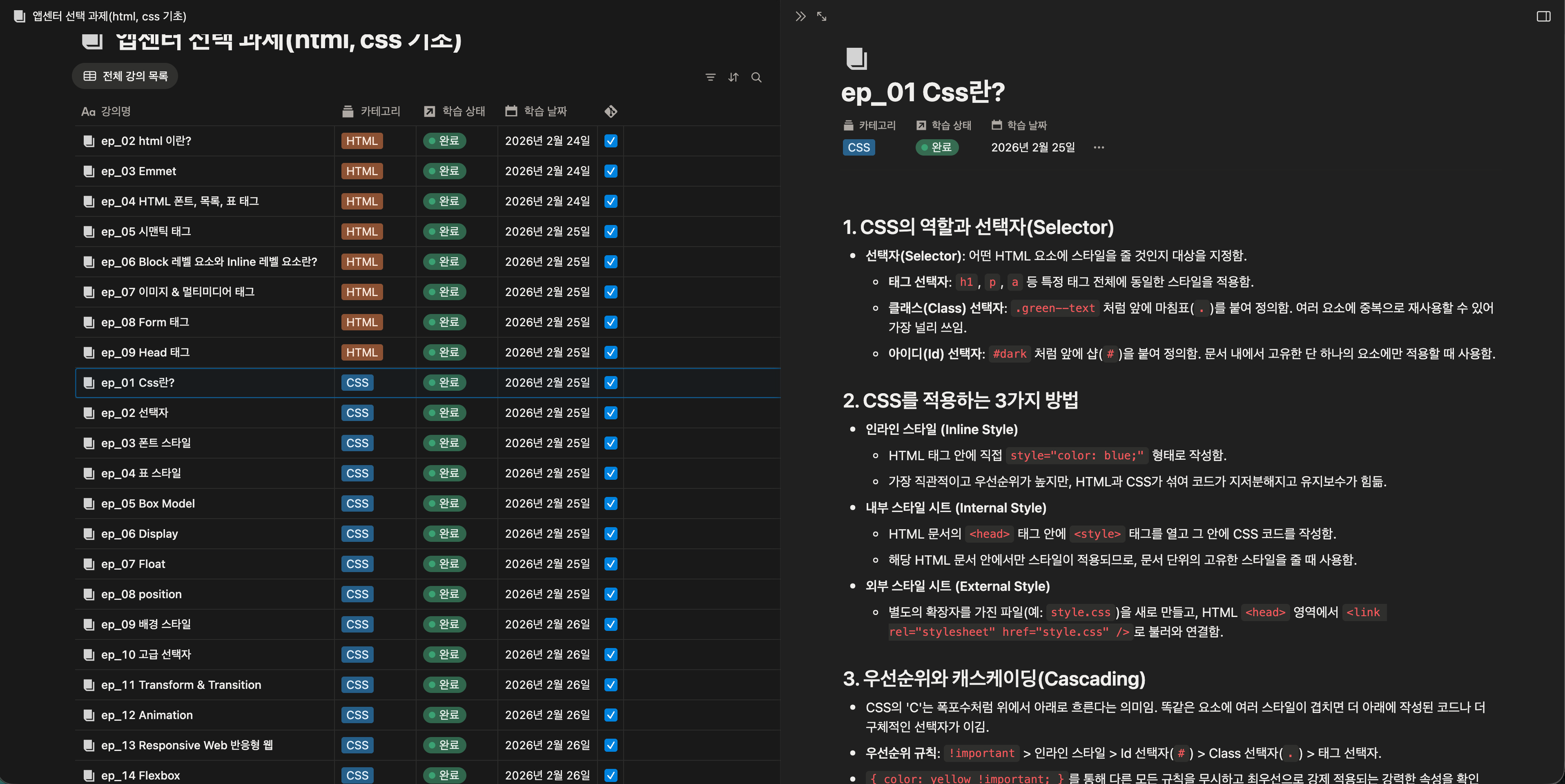 최근 개인 프로젝트와 이력서, 코딩테스트를 준비 중이라 매일 시간을 들여 진행하기 힘들 것 같다고 판단하여 2월 24, 25, 26일 매일 새벽 3~4시까지 강의를 들었습니다. 강의를 들으면 Notion 페이지에서 보시다싶이 소주제별로 나눠서 개념을 정리했고 실습 코드는 바로바로 GitHub Repo에 커밋을 하였습니다. 또한 수업 자료 Repo의 image나 mp3 파일을 참고하기도 했습니다. 사실 HTML, CSS를 고등학교 때부터 접해왔던 언어라 "아 이런 내용이 있었지?" 훑어보는 느낌으로 2배속하여 들었습니다. GitHub 커밋은 docs, feat, chore 나누어 진행했습니다.