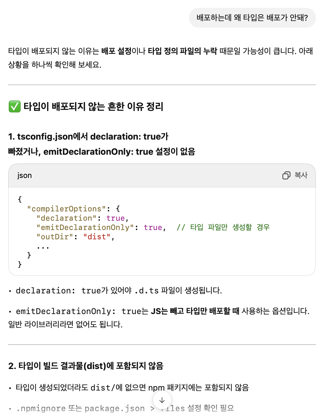처음엔 npm 타입스크립트 빌드, npm build 타입 선언 파일 같은 키워드로 열심히 검색해봤지만, 딱 맞는 해결법이 보이지 않았습니다.