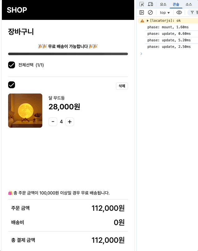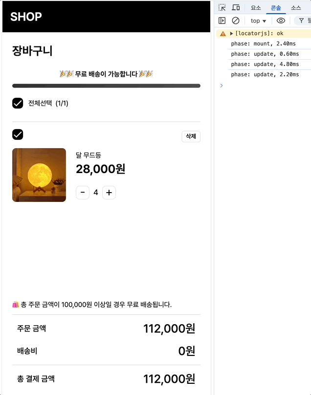 (수량 변경시 콘솔이 3번 출력되는 이유는, 수량 증가 버튼 클릭 → 상태 변경 발생 → 관련된 자식 컴포넌트들 최소 3개가 재렌더링되며 각각의 렌더링마다 onRender가 호출되고 있는 것입니다.)