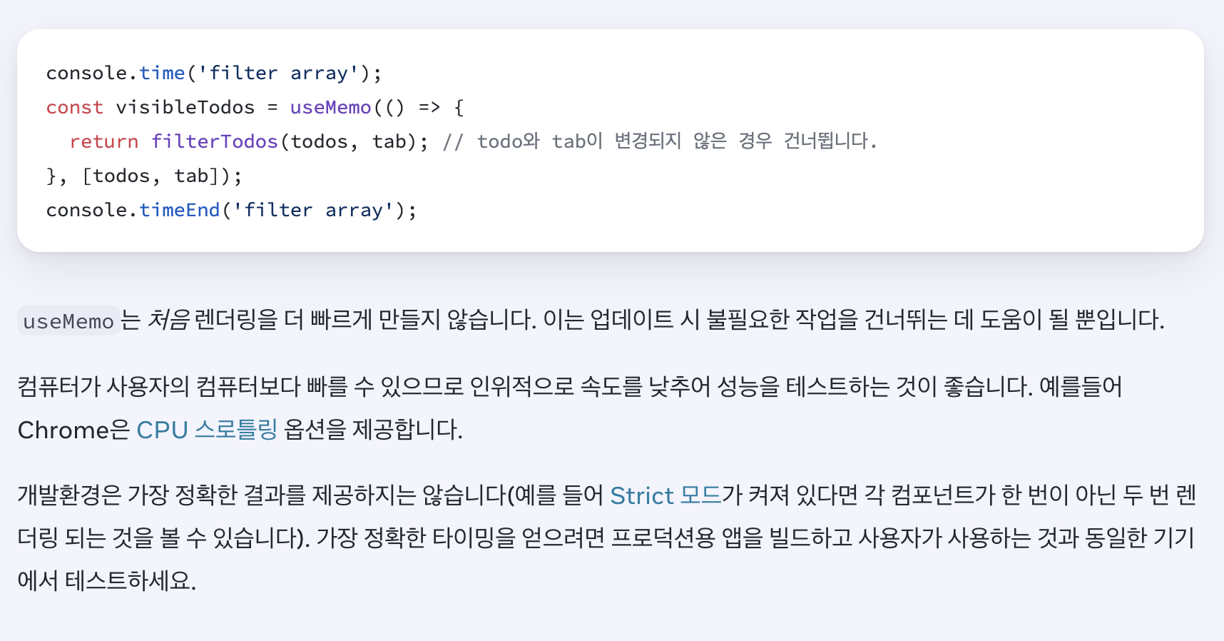 개발 환경에서의 측정 결과가 프로덕션과 다를 수 있다는 뜻입니다. StrictMode로 인해 의도적으로 초기 렌더링을 두 번 수행하기 때문입니다. 개발자의 코드가 순수하고 안전하게 동작하는지 검증하기 위한 목적이지만, 이로 인해 useMemo나 useCallback의 성능 효과를 제대로 체감하기 어렵습니다.