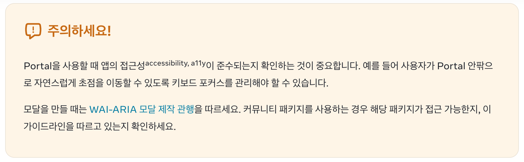 createPortal을 사용하면 DOM 구조가 시맨틱하지 않게 변할 수 있어 접근성 문제가 발생할 수 있습니다. 특히 모달이나 툴팁과 같은 요소를 구현할 때 적절한 aria-* 속성과 포커스 트랩, ESC 키 닫기 등의 키보드 내비게이션 처리가 필요합니다.