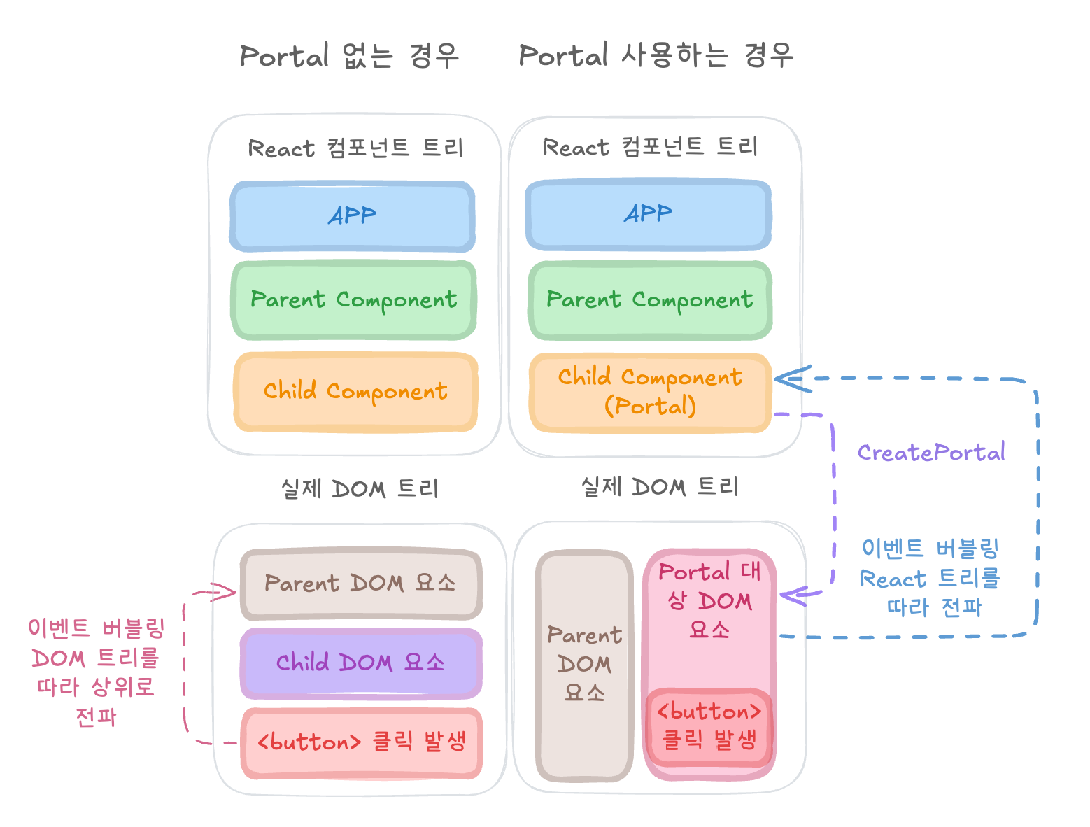 리액트에서는 createPortal로 렌더링된 요소의 이벤트가 물리적인 DOM 구조가 아닌, 리액트 내부 컴포넌트 트리를 기준으로 버블링됩니다. 즉, 화면상으로는 DOM이 분리되어 있더라도, 리액트 입장에서는 해당 컴포넌트가 원래 있던 위치에서 발생한 것처럼 인식합니다.
