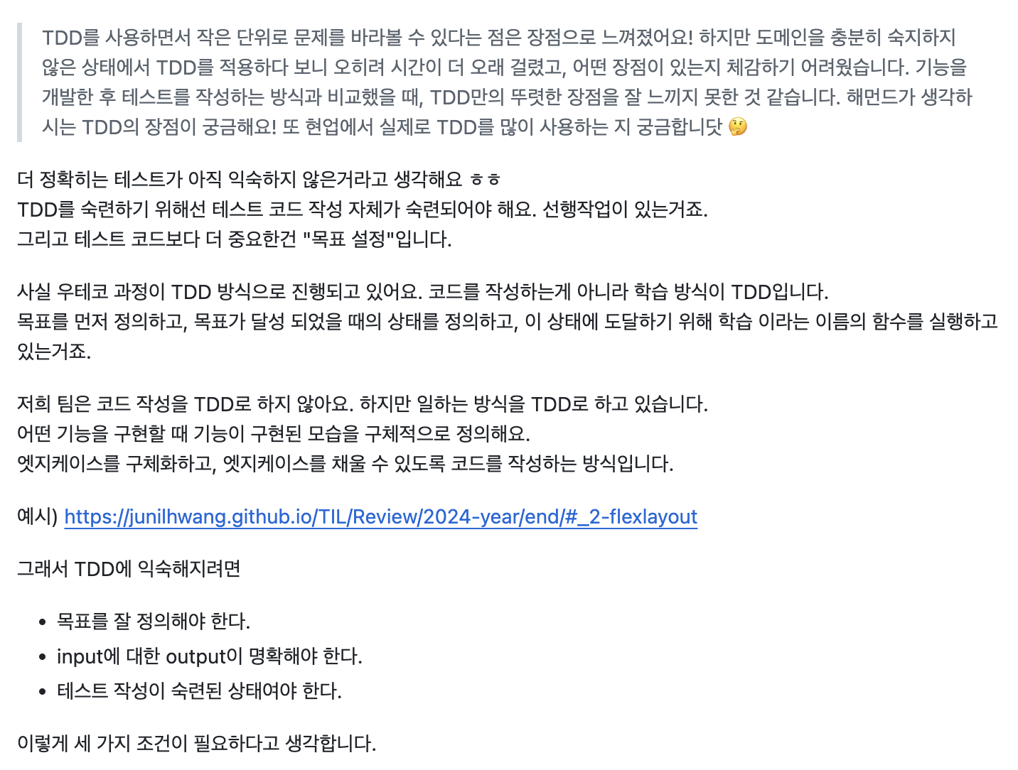 이 대답을 듣고, 지금껏 테스트를 기술로만 접근하고 있었던 제 관점이 완전히 뒤집혔습니다. TDD는 단순한 개발 방식이 아니라, 문제 해결 방식 자체를 바꾸는 철학이라는 걸 처음으로 체감할 수 있었습니다.