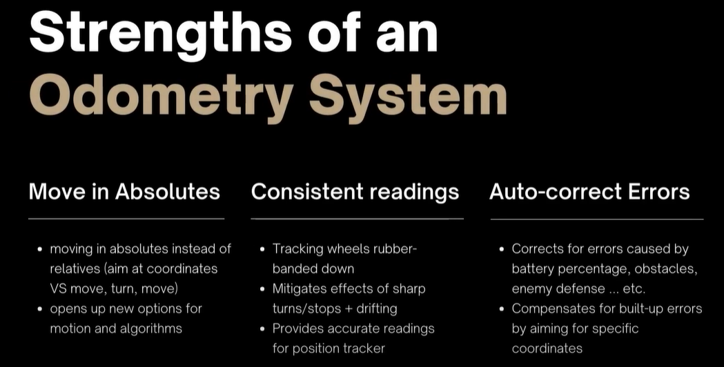 오도미터를 통해 로봇이 어느 위치의 필드에 있는지 알 수 있고, 상대적으로 이동하는 대신 절대적인 좌표를 목표로 하기 때문에,