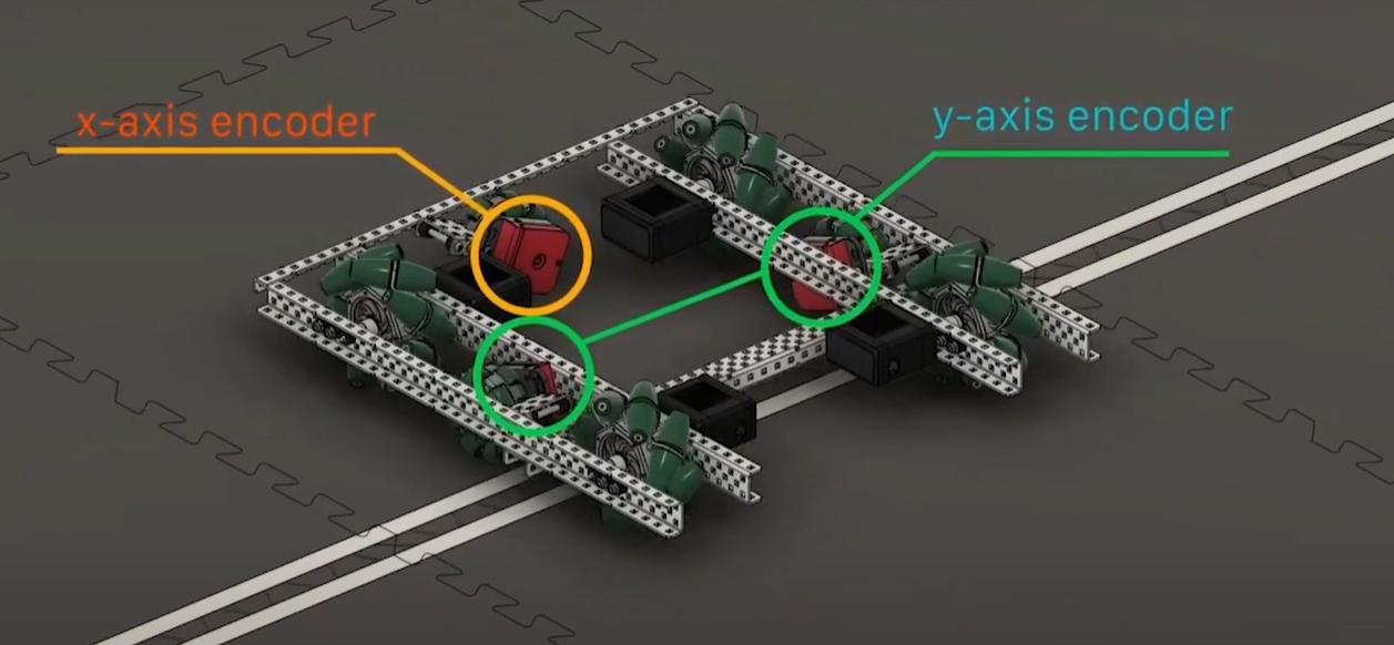 또 다른 장점은 추적 휠이 항상 필드 표면에 고무줄로 고정되어 있기에, 로봇이 급정거하거나 드리프트하여 뛰어올라도 추적 휠이 항상 필드와 접촉하여 인코더가 계속 값을 기록함.