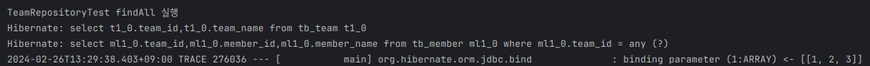 log를 살펴보면 array [1, 2, 3]이 파라미터로 binding됐다. 이렇게 해서 N+1을 방지하자는 뜻인데