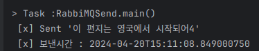 RabbiMQSend쪽 콘솔이다.