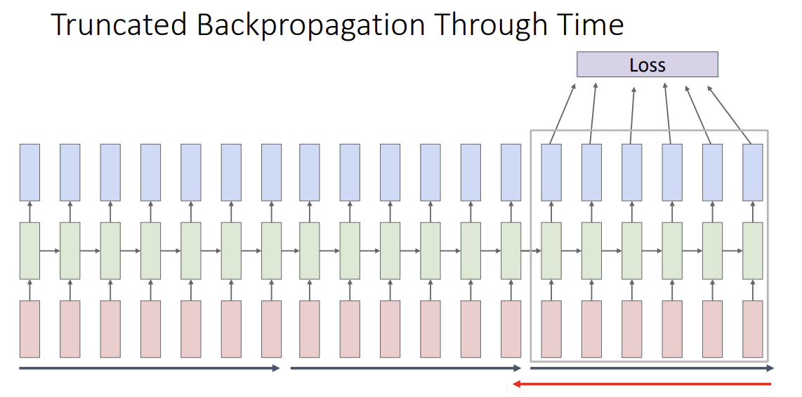 loss 계산을 위해서 entire sequence forward 진행, gradient 계산을 위해서 entire sequence backward 진행 하면 너무 많은 memory가 사용된다.