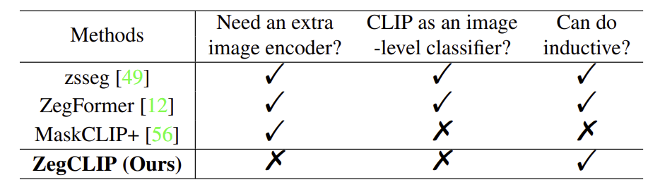 - Zegformer and zsseg : develop an extensive proposal generator and use CLIP to classify each region, then 예측 결과를 통합 -> 이러한 방법 이미지 수준에서 CLIP의 제로샷 능력을 유지하지만, 각 제안을 분류해야 하므로 계산 비용이 불가피하게 증가