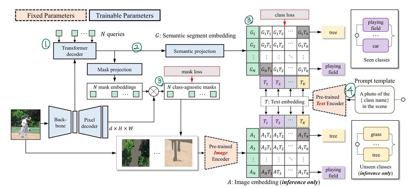 6. semantic segment embeddings과 image embeddings을 사용해 두 가지 segment-level classification scores를 얻을 수 있다. 이 두 classification scores를 결합하여 segments의 최종 class prediction을 도출한다.