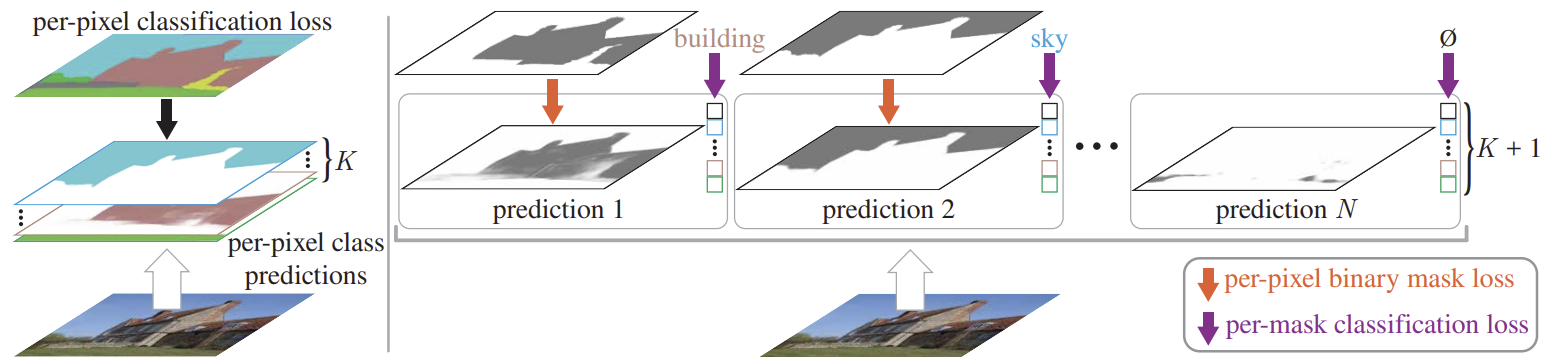 ZegFormer의 학습 과정에서는 S에 속하는 픽셀 레이블만 사용된다. 학습 손실을 계산하기 위해 이분 매칭(bipartite matching) 이 예측된 마스크와 ground-truth masks 사이에서 수행된다. 각 세그먼트 쿼리에 대한 분류 손실은 다음과 같이 계산된다: