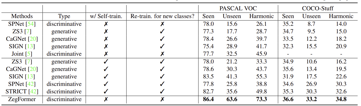 하지만 pixel-level zero-shot classification problem는 text embedding이 주로 objects/segments를 설명하는 데 사용되므로 ZS3 문제에 적합하지 않을 수 있다. 이에 대한 다양한 해결책들이 제안되었으나, 새로운 클래스가 등장할 때마다 모델을 재학습해야 하는 한계가 있다.
