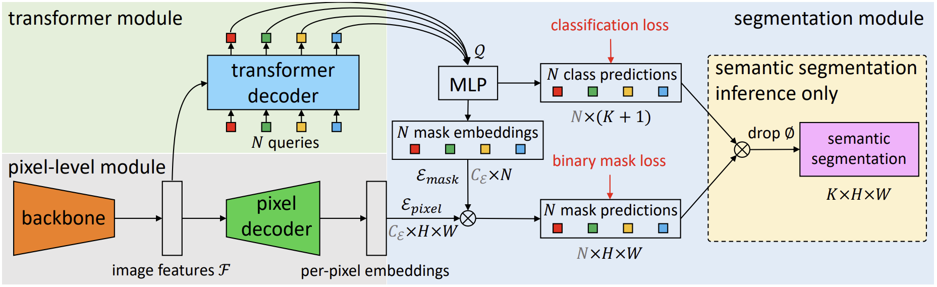 3. Mask embedding은 pixel decoder의 출력과 곱해져 class-agnostic binary mask를 생성하고, semantic embedding은 text embeddings을 통해 분류된다.