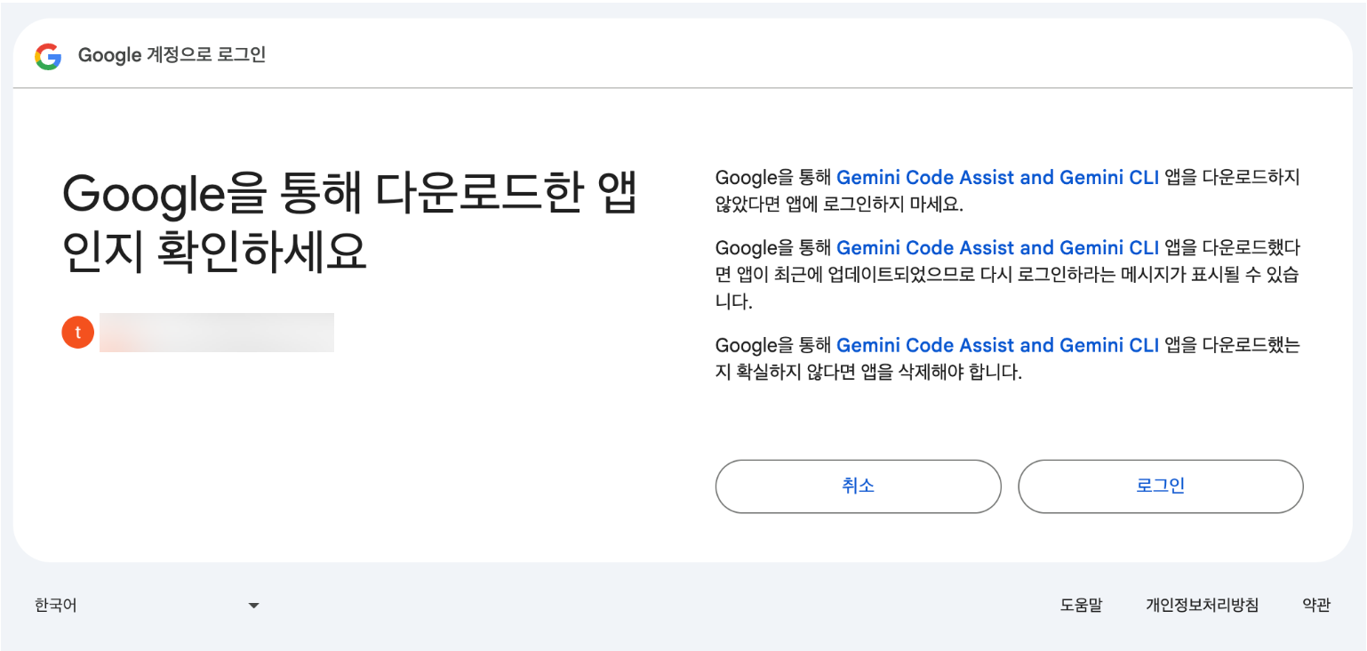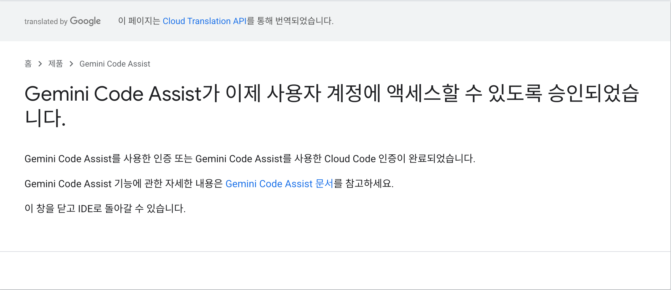 "Gemini Code Assist가 이제 사용자 계정에 액세스할 수 있도록 승인되었습니다."