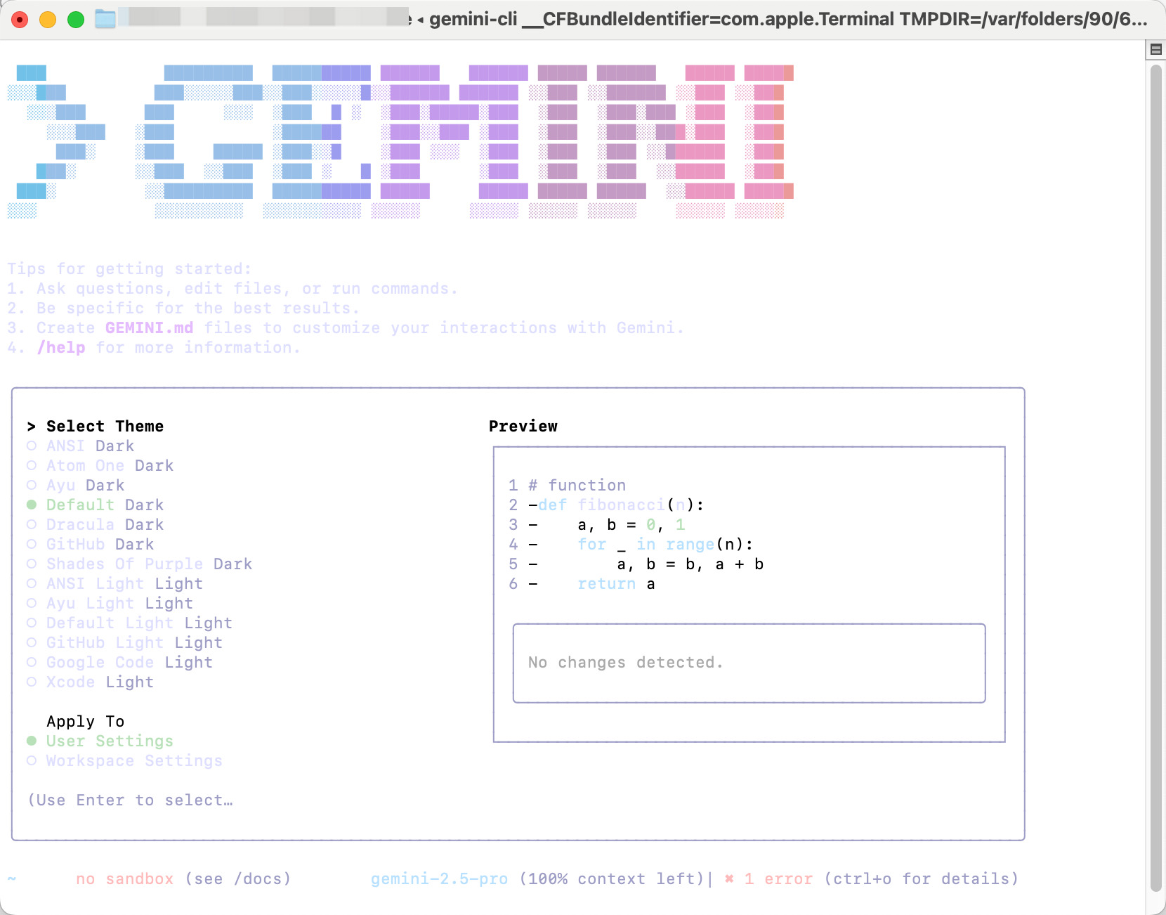 설치 후, 대화형 CLI를 시작하려면 터미널에 gemini