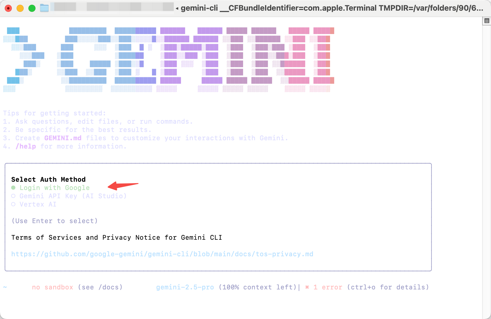 로그인 방법을 선택하세요. "Google로 로그인"이 권장되며, 이를 통해 분당 60개 요청과 하루 1,000개 요청의 제한으로 무료로 사용할 수 있습니다. 선택 후 Enter 키를 누르세요.