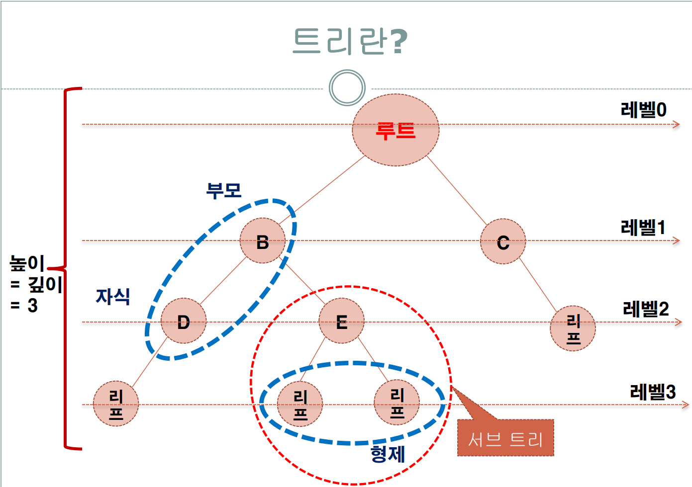 • 서브트리(subtree) : 트리 안에서 다시 어떤 노드를 루트로 정하고 그 자손으로 이루어진 트리