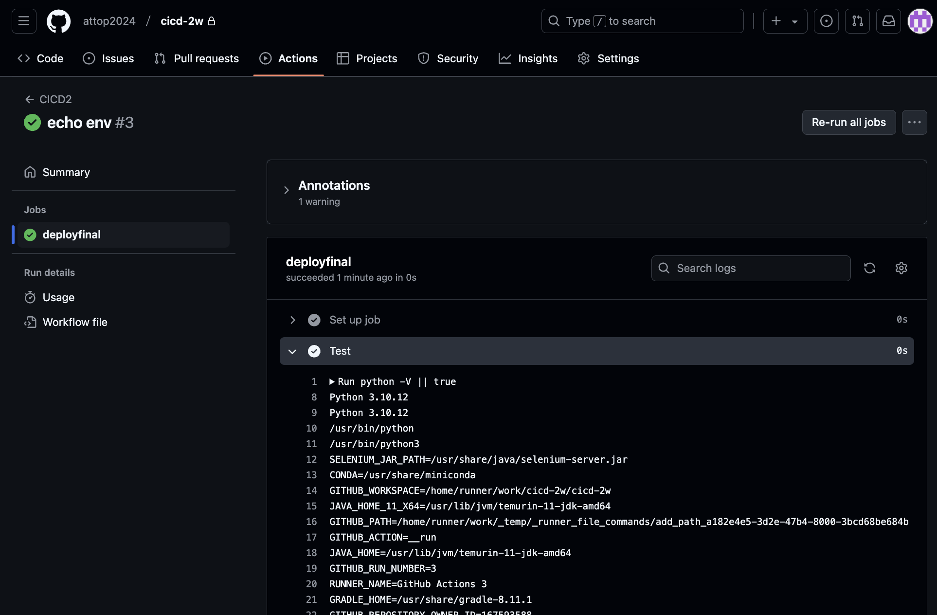 코드 및 워크플로우 수정 후 pc에서 push후에 github actions에서 job이 수행된 것이 확인됨