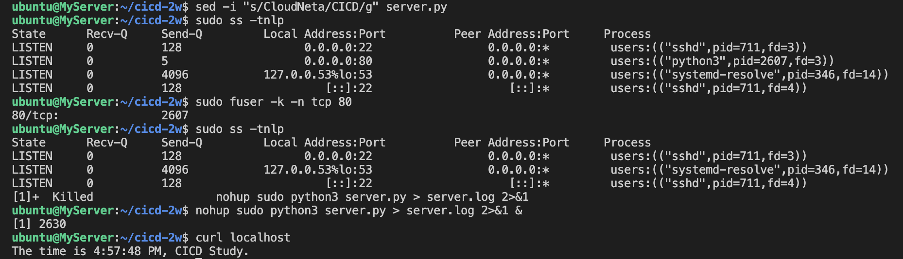 sed -i -e "s/CICD/CICD 2w/g" server.py