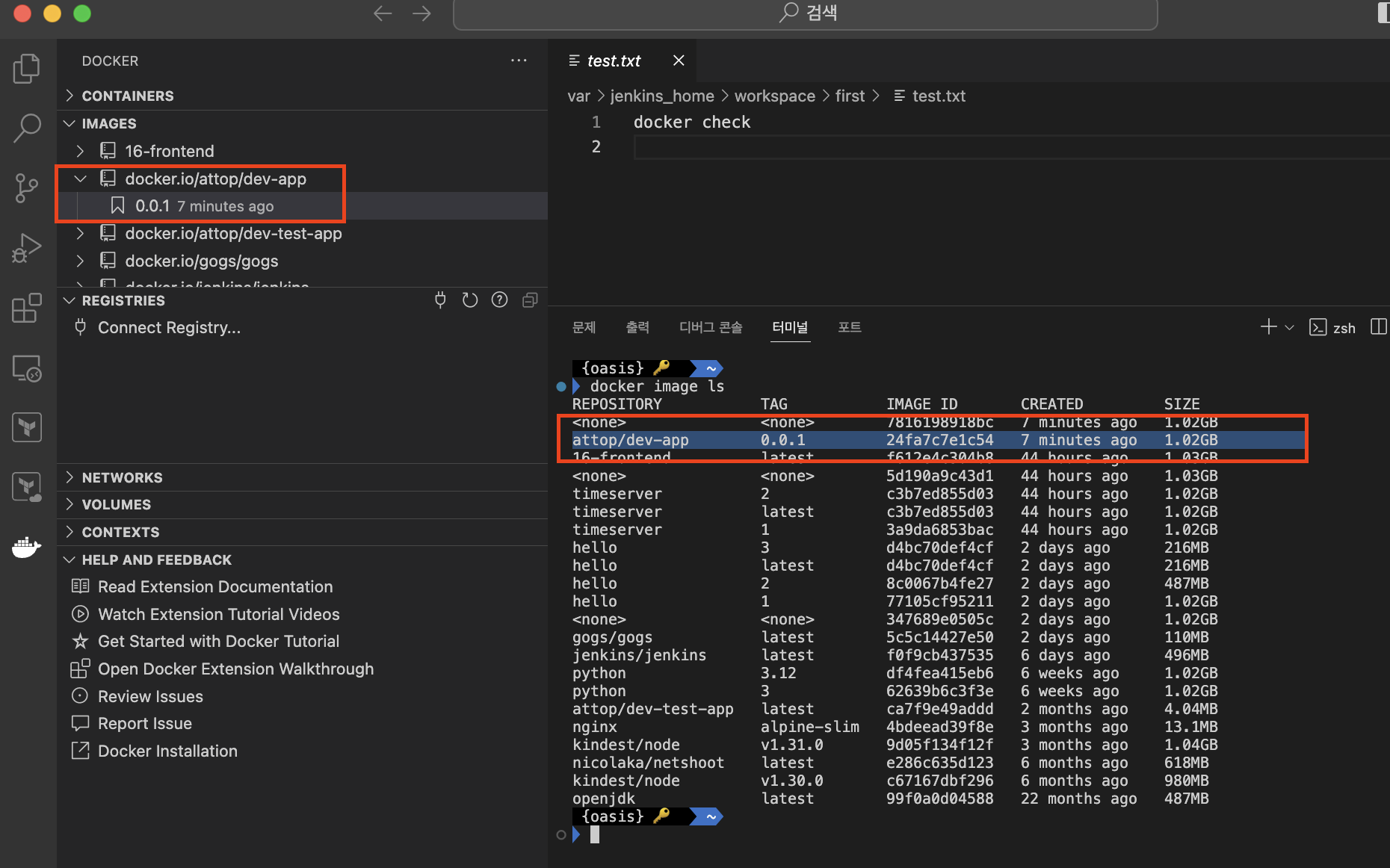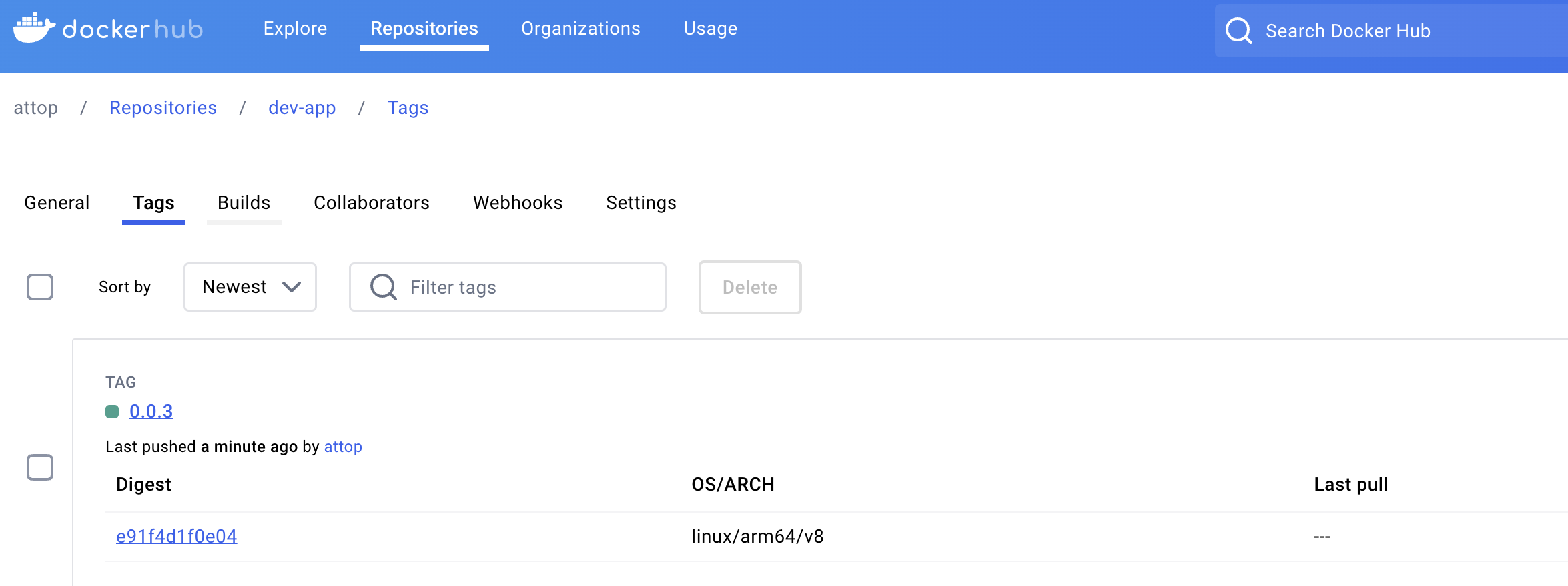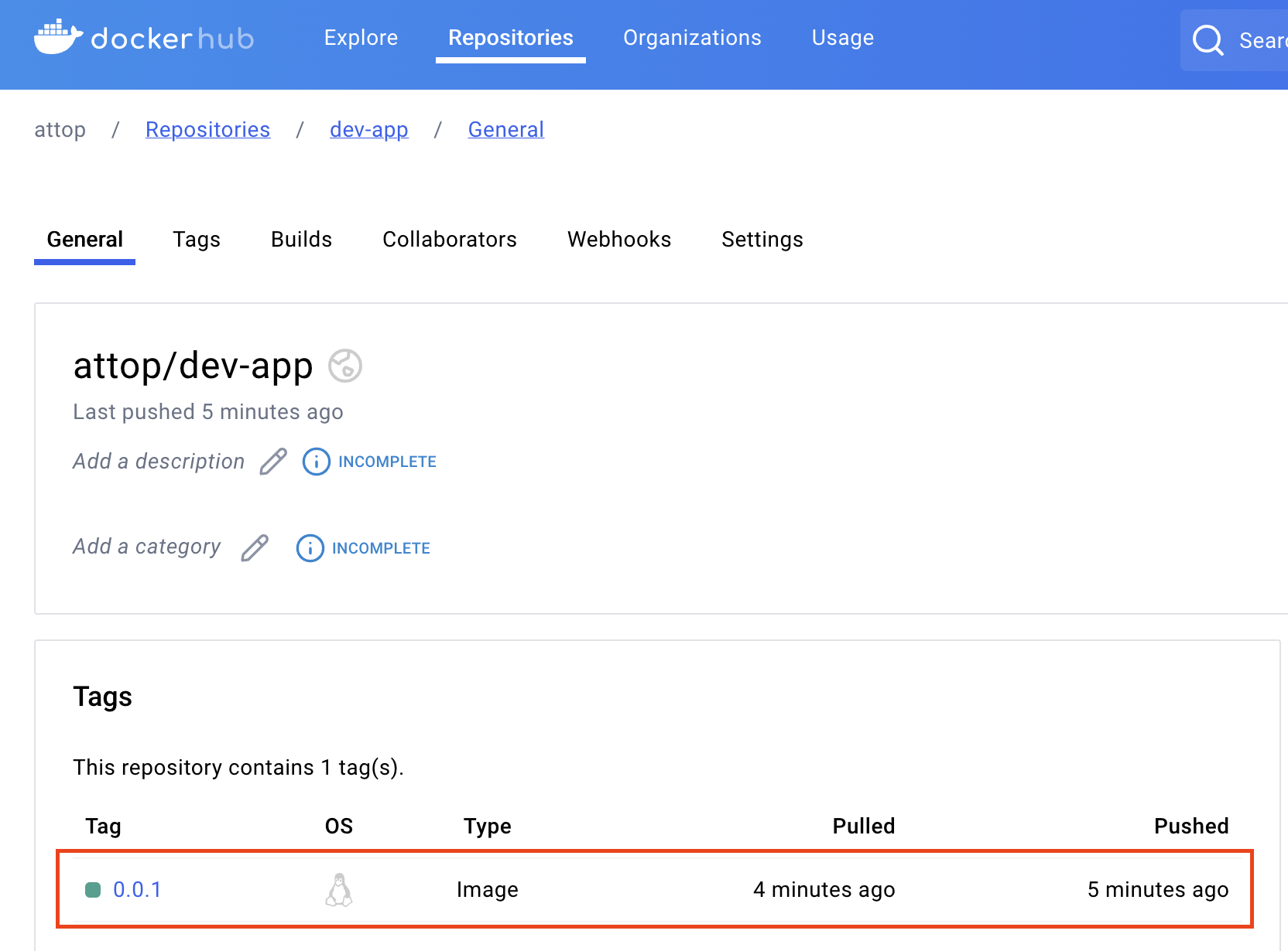도커허브에도 이미지가 push되어 있다.