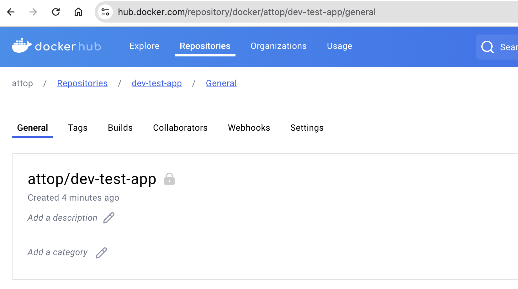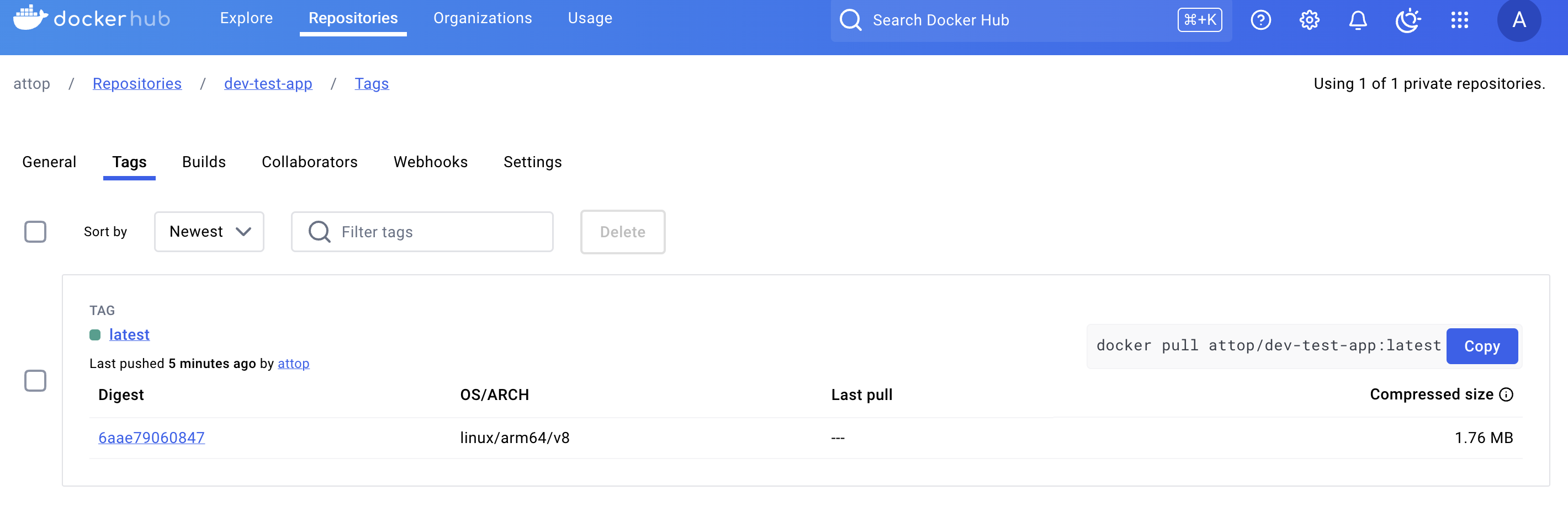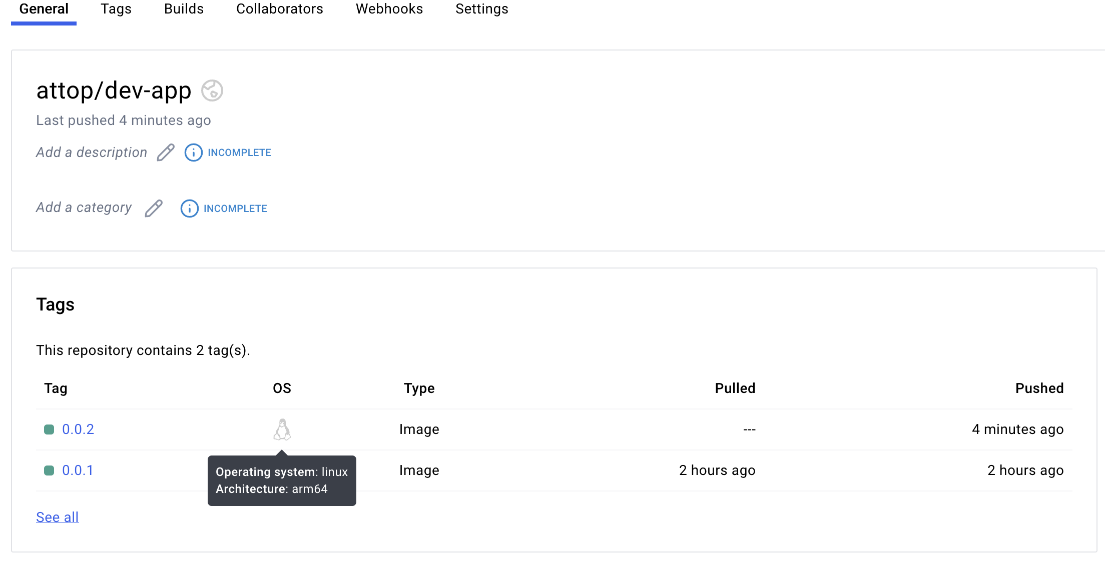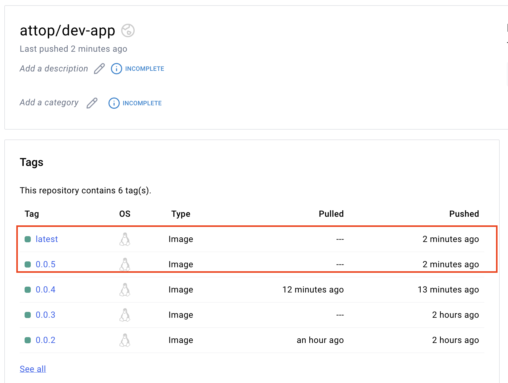 도커허브에도 이미지가 push되어 있다.