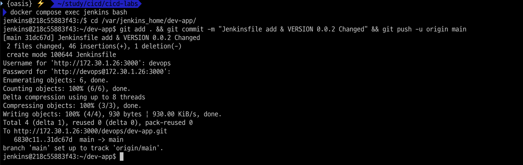 docker compose exec jenkins sh -c 'echo "0.0.2" > /var/jenkins_home/dev-app/VERSION'