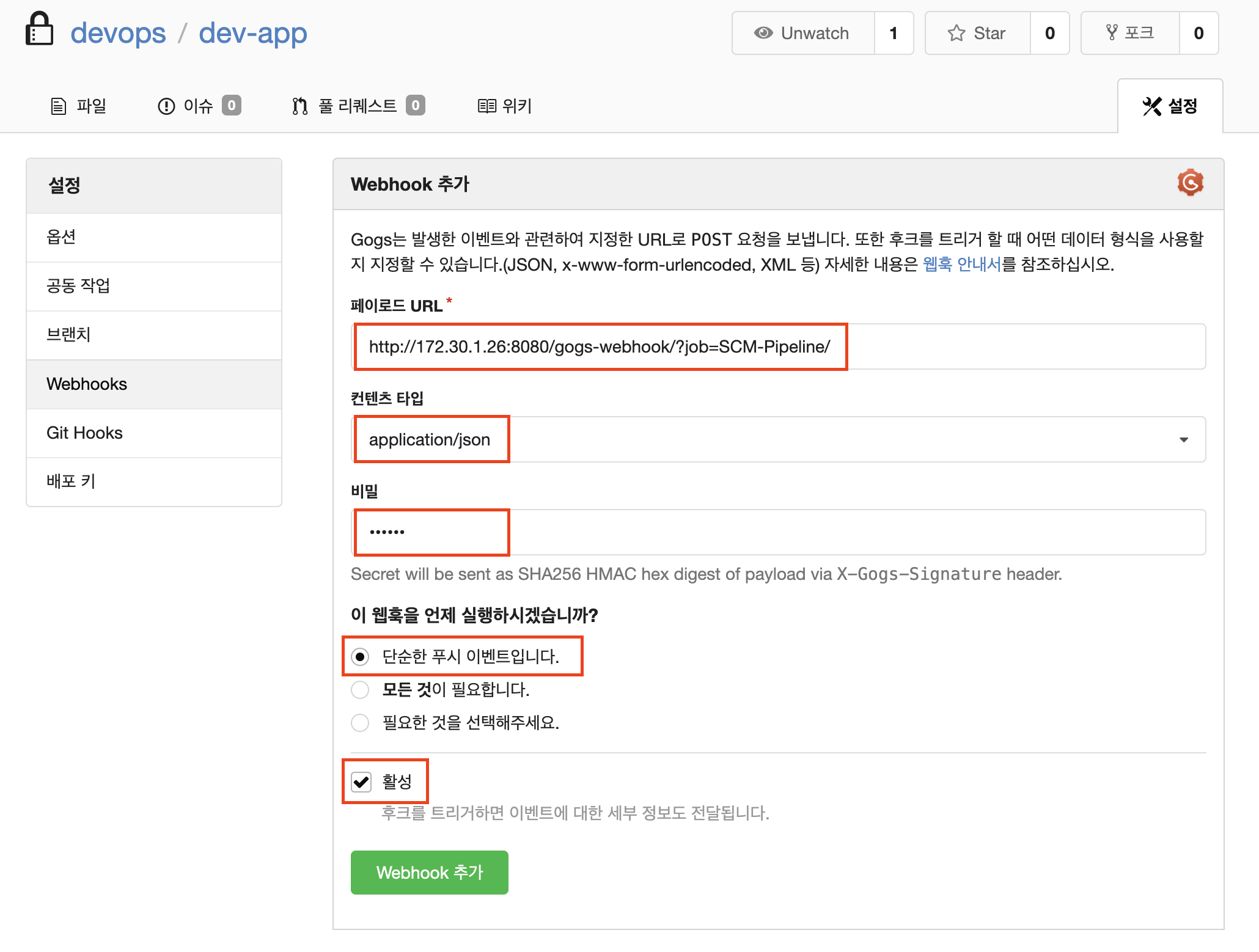 그리고 Gogs 설정에서 아래의 값들을 webhook에 셋팅해 줍니다.