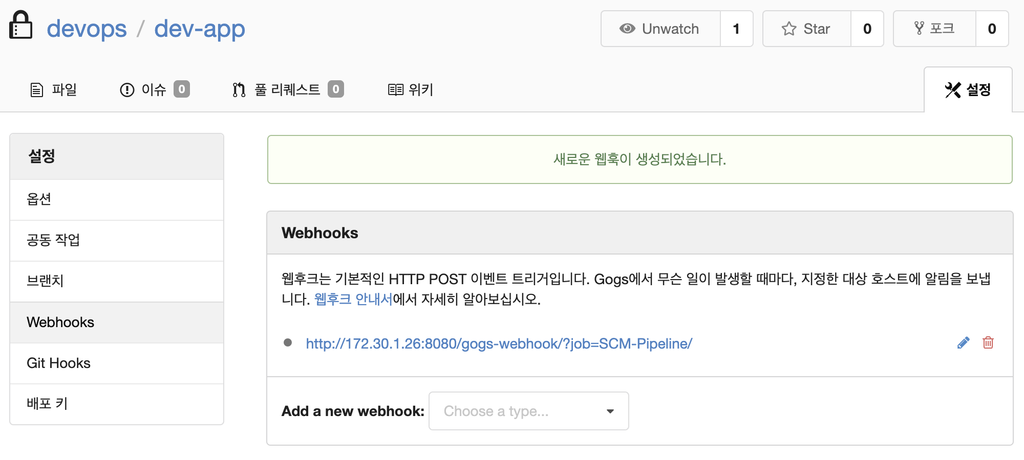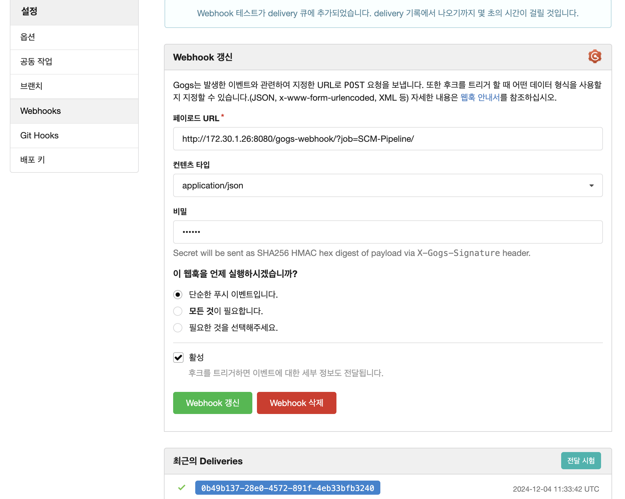 - Payload URL : http://(localIP):8080/gogs-webhook/?job=**SCM-Pipeline**/