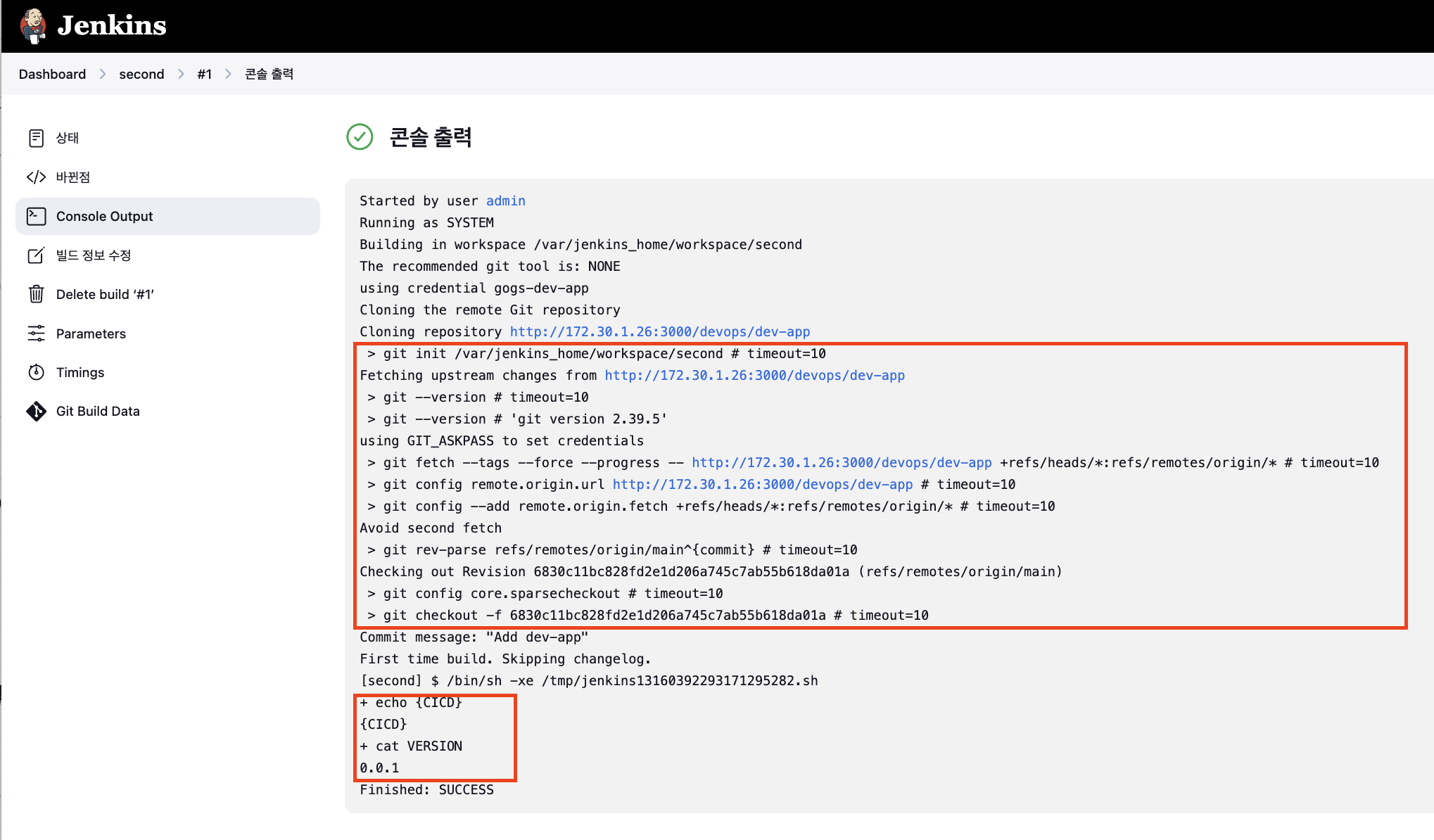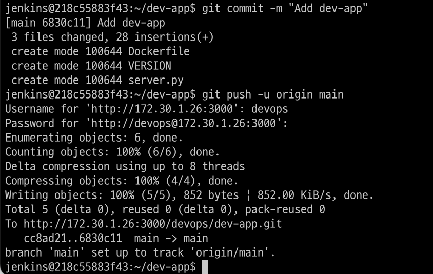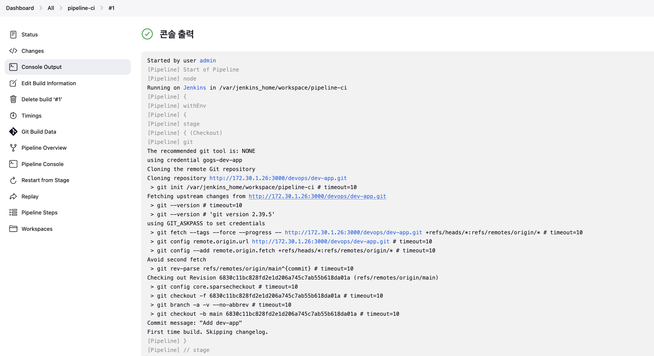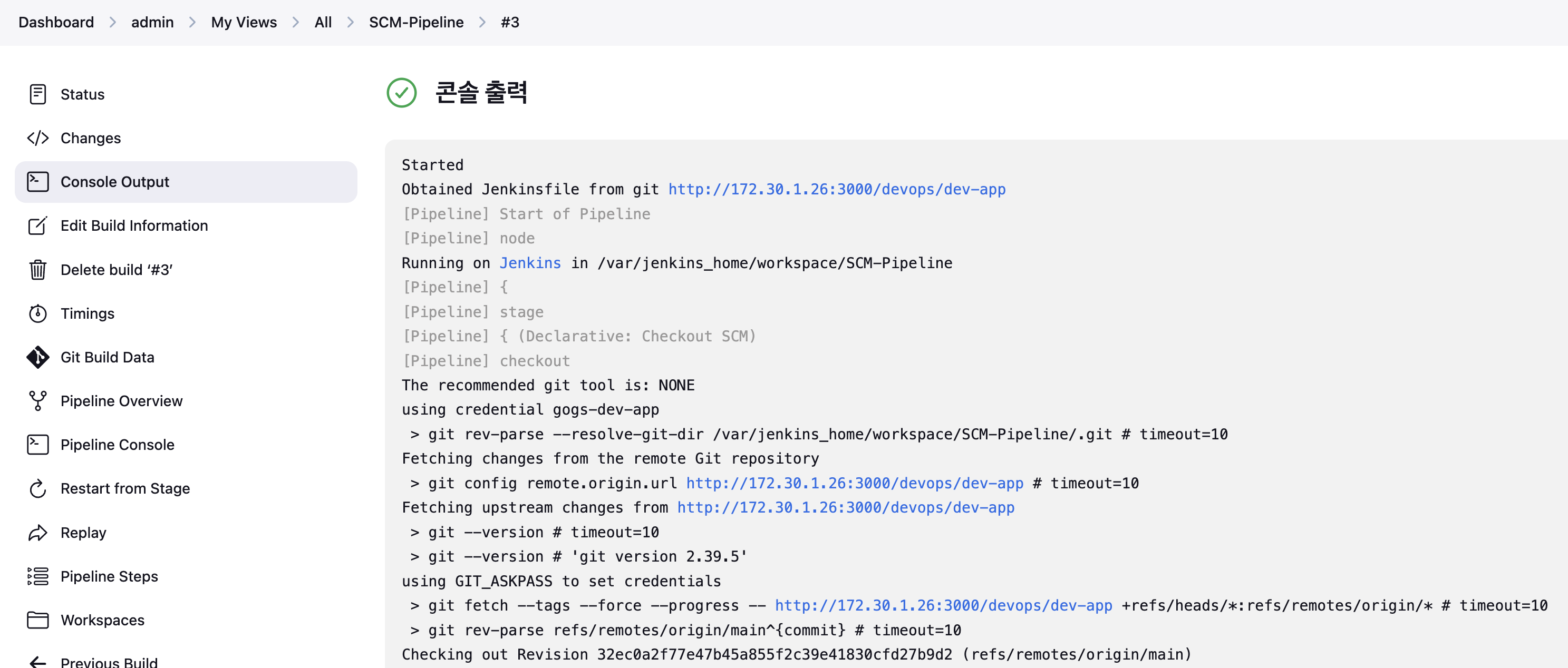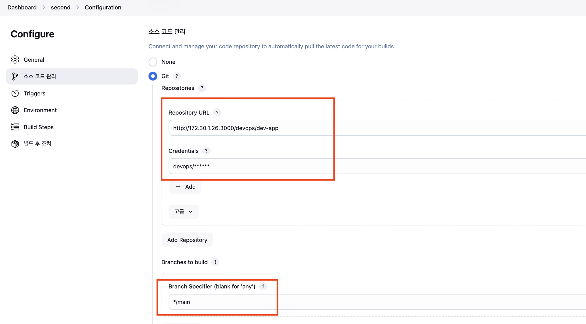 url: 'http://172.30.1.26:3000/devops/dev-app.git', // Git에서 코드 체크아웃