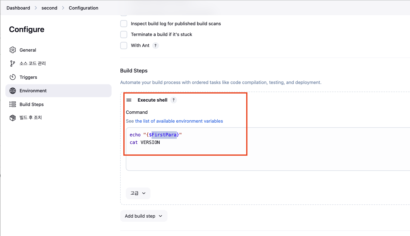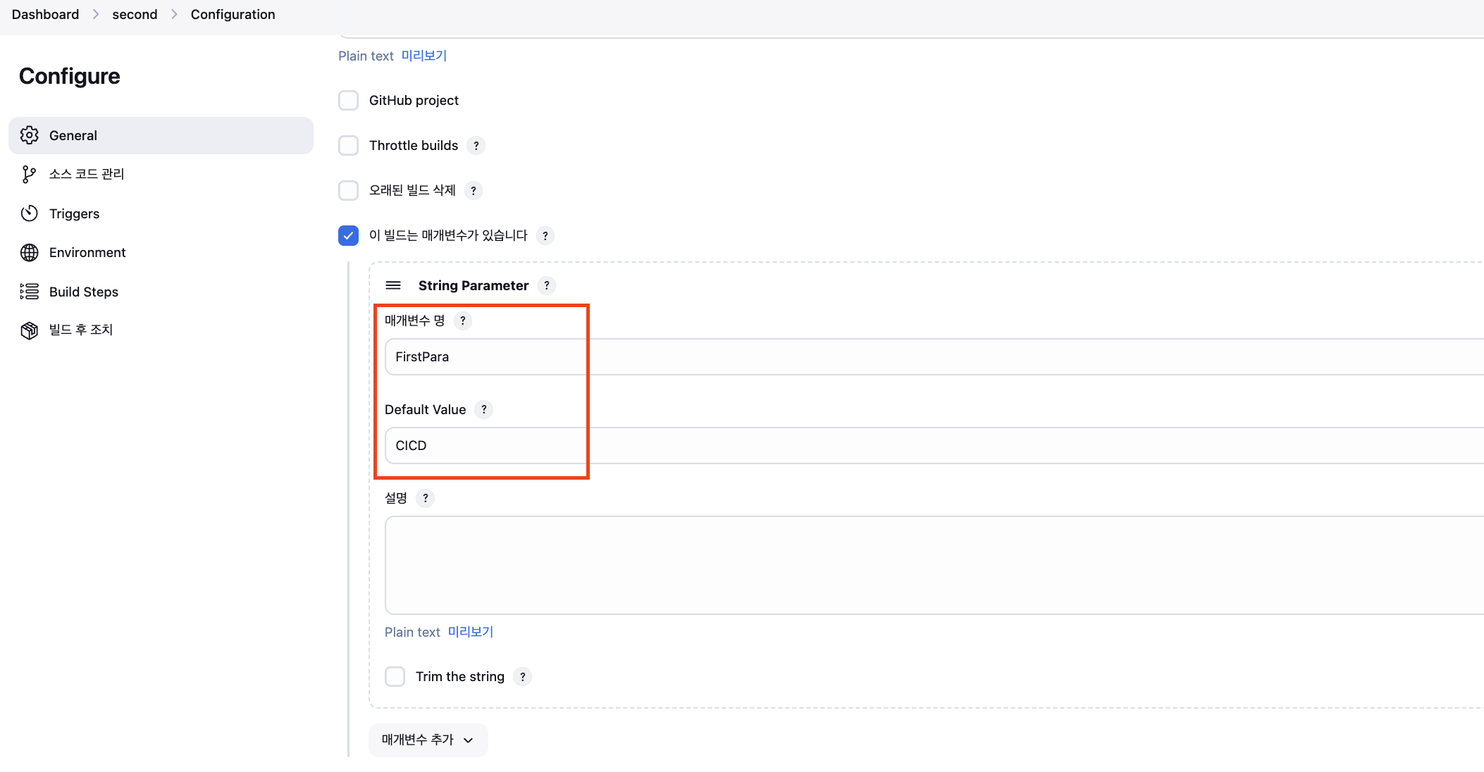 생성된 파이프라인의 설정값에서 아래에 값들을 입력해 줍니다.